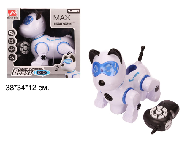 Собака на р/у арт. 2629-T10B Робот интеракт. свет, звук в кор.•Робот умеет ходить в разные стороны, танцевать под музыку, рассказывать скороговорки, считалочки, а голос робота и световые эффекты добавят правдоподобности игре.