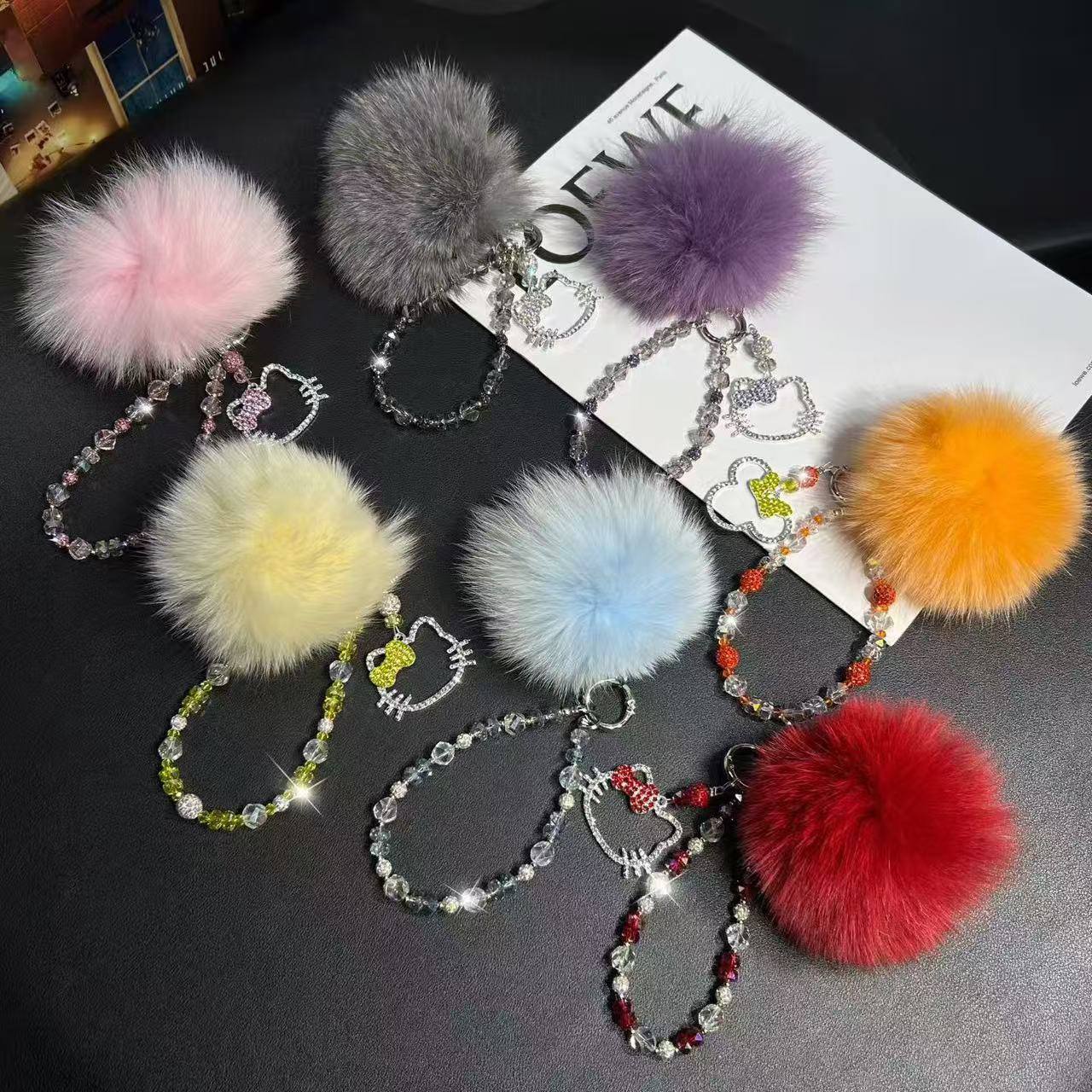 Брелок-подвеска арт. 209386 Кошка в стразах и меховой шарик 1 шт цвета микс в пак.